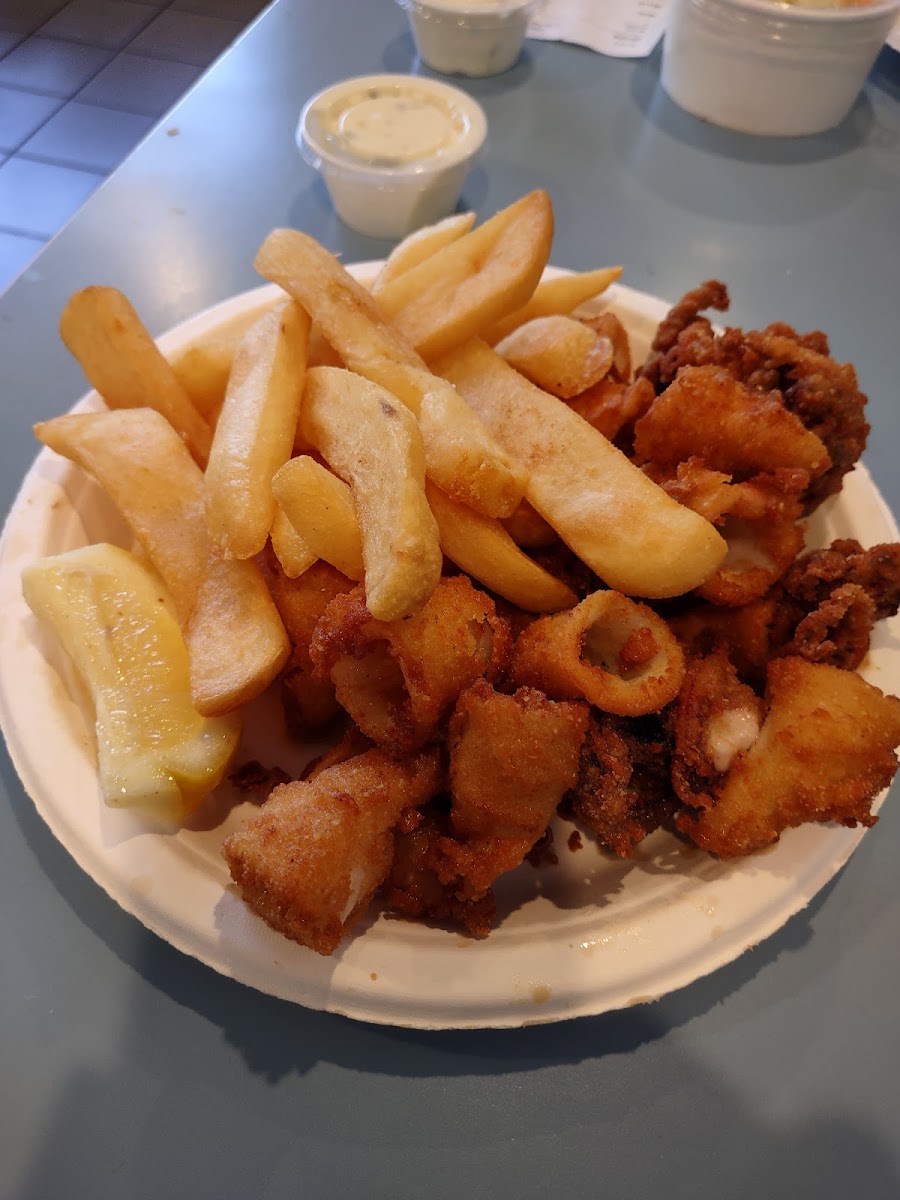 Ok. Super cool menu. Lotsa stuff to choose from. Thankfully it's set up so that you can "a la carte" whatever you want. I did it up like this. 12 ounce cioppino It was flavorful, hot and chalk full of fish and various shellfish. I got a cod and a halibut. Both were piping hot and fried to perfection. I got 4 fried shrimp. Also perfectly. Fried. The sauces are delicious. The fries were well fried and tasty. I also got 6 huge fresh shucked oysters. They were fresh and flavorful and super yummy. I chased it all down with an ice cold Tejava tea. Wife got a fried shrimp sandwich with chowder and fries. She declared all of them flavorful and yummy. The total bill was reasonable and the food was great. Staff were friendly and they have an insane fresh seafood counter next door. Awesome random Yelp find. Oh ! And. Free parking lot and clean bathrooms.